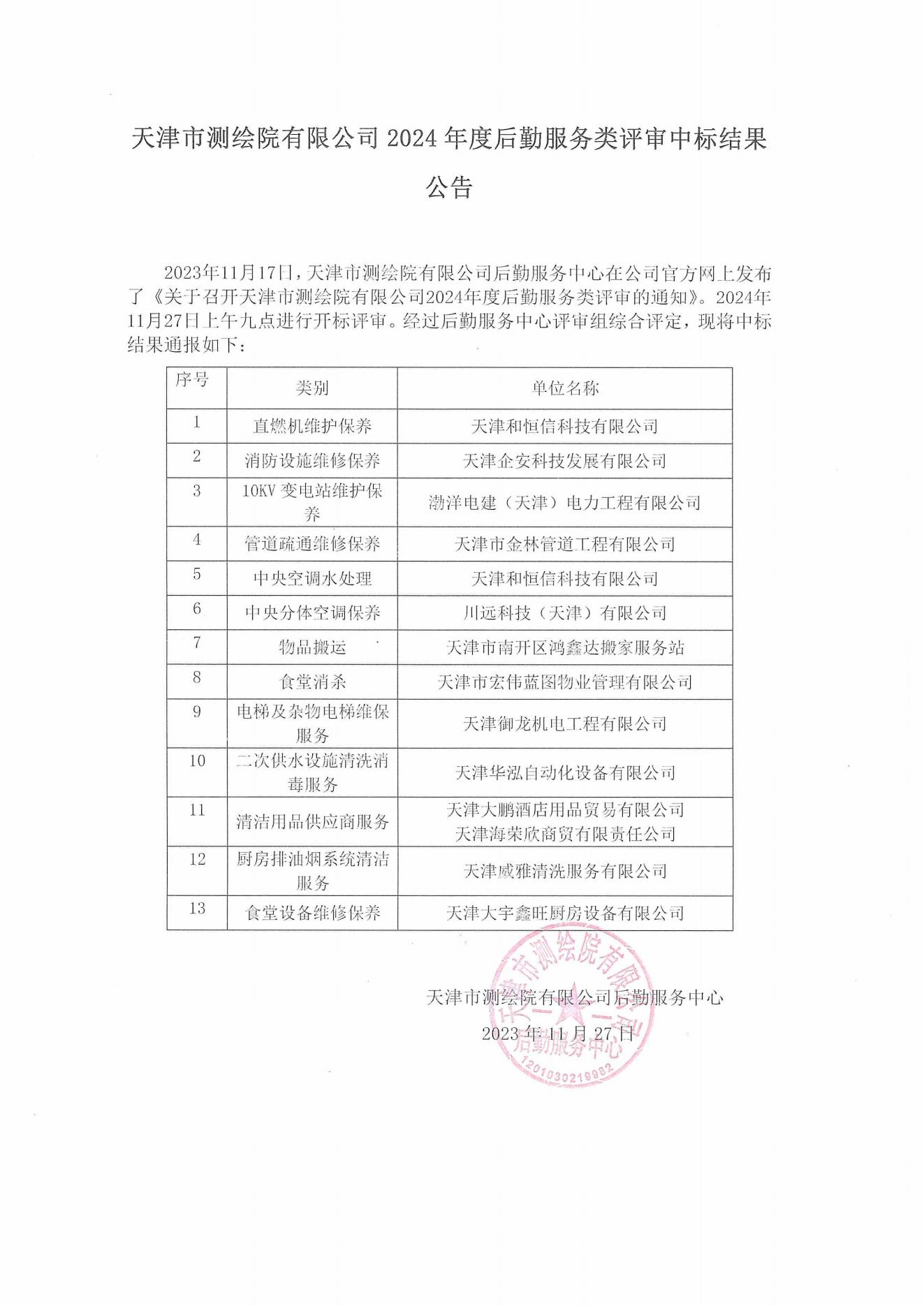 天津市測(cè)繪院有限公司2024年度后勤服務(wù)類(lèi)評(píng)審中標(biāo)結(jié)果公告 2023-11-29