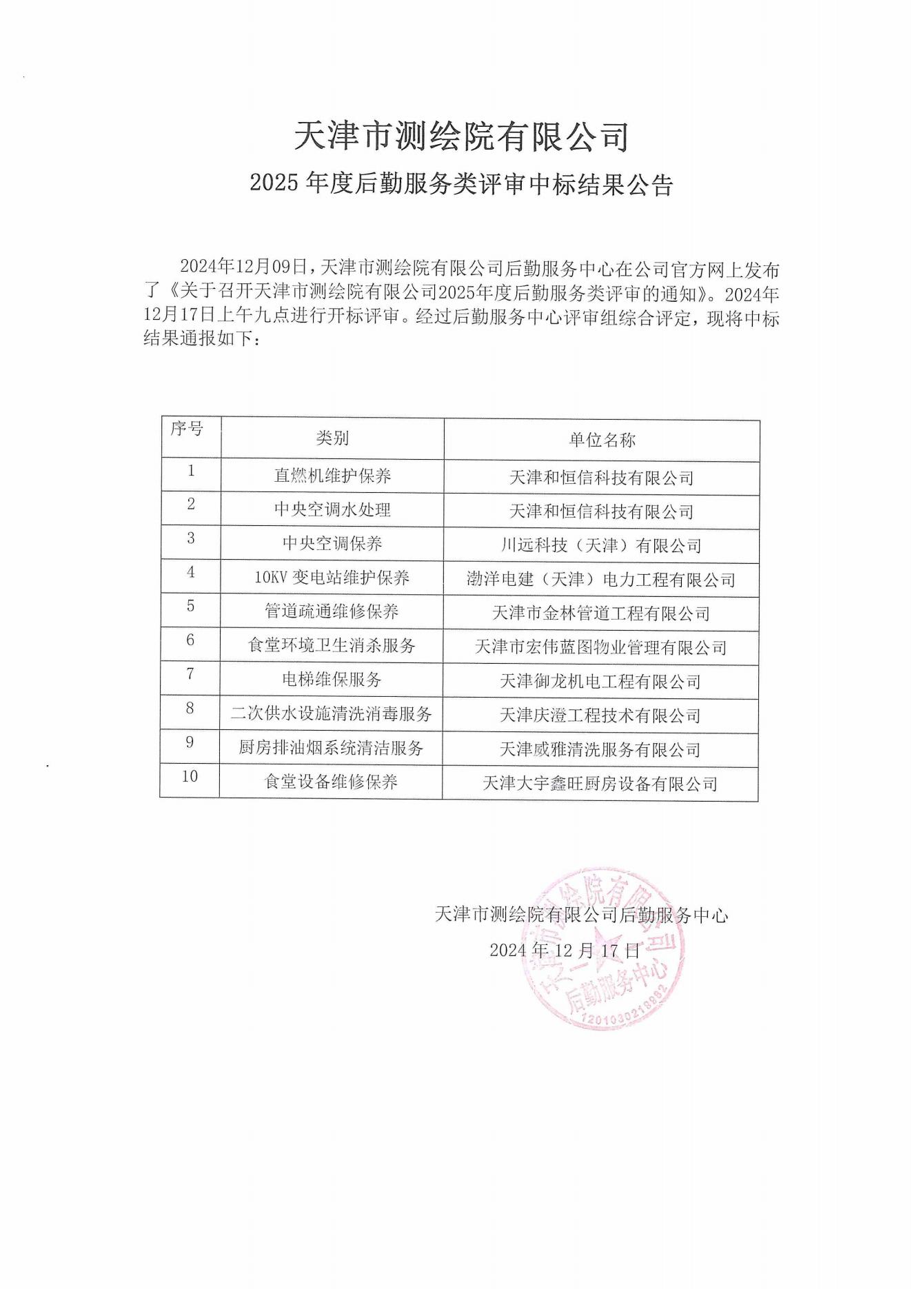 天津市測繪院有限公司2025年度后勤服務(wù)類評審中標(biāo)結(jié)果公告