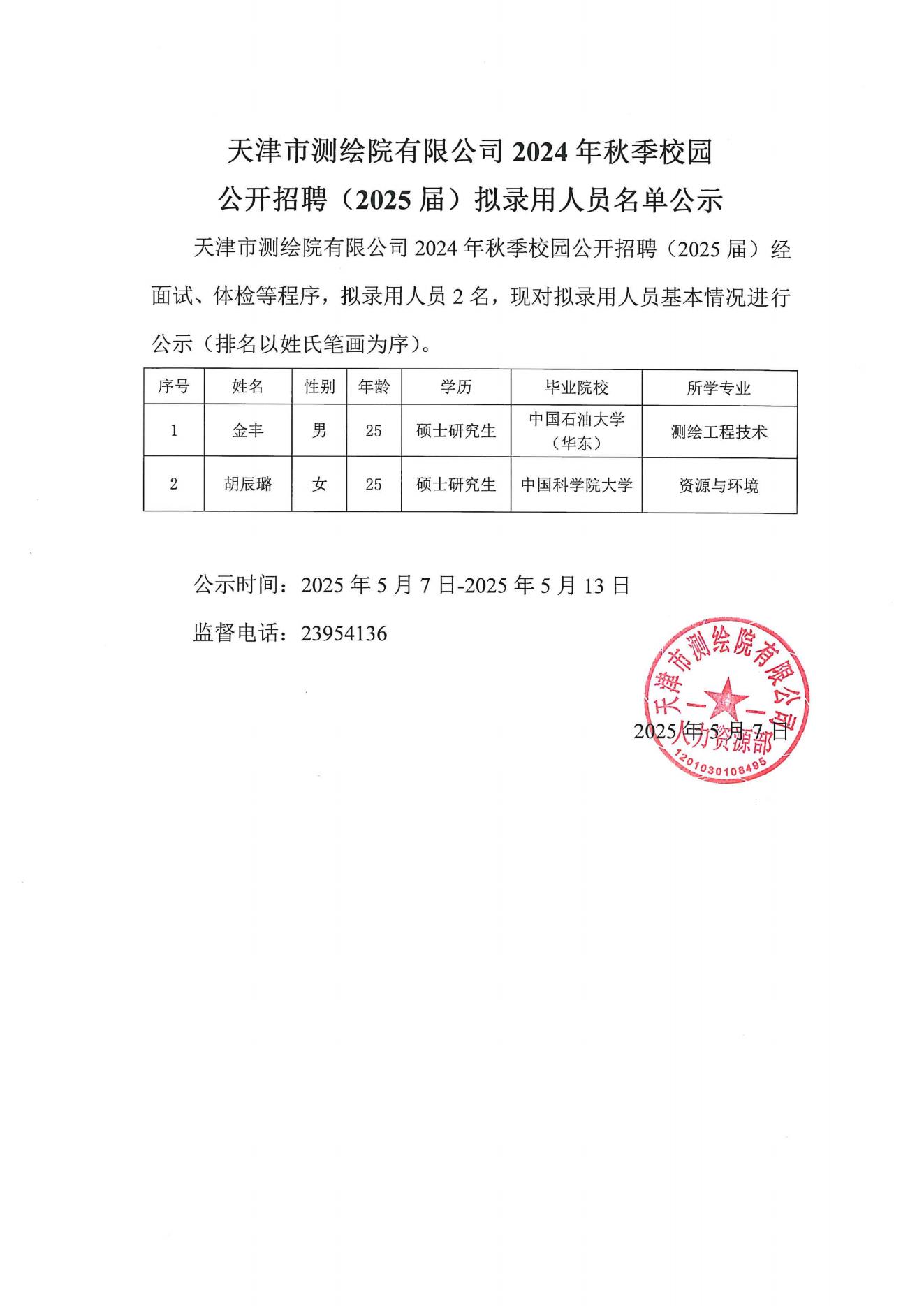 下一篇:天津市測(cè)繪院有限公司2025年春季校園公開招聘(2025屆)擬錄用人員名單公示