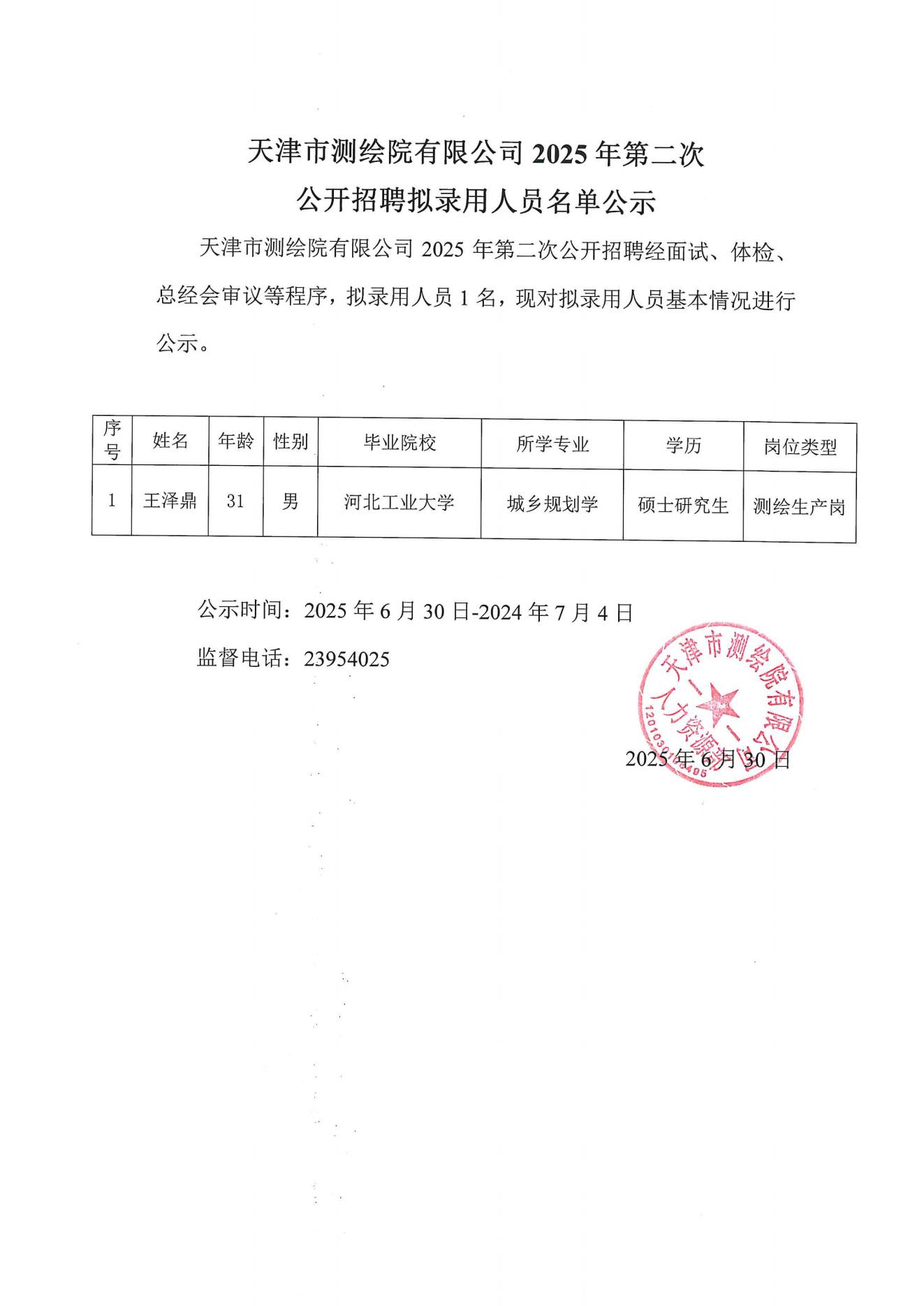 天津市測繪院有限公司2025年第二次公開招聘擬錄用人員名單公示