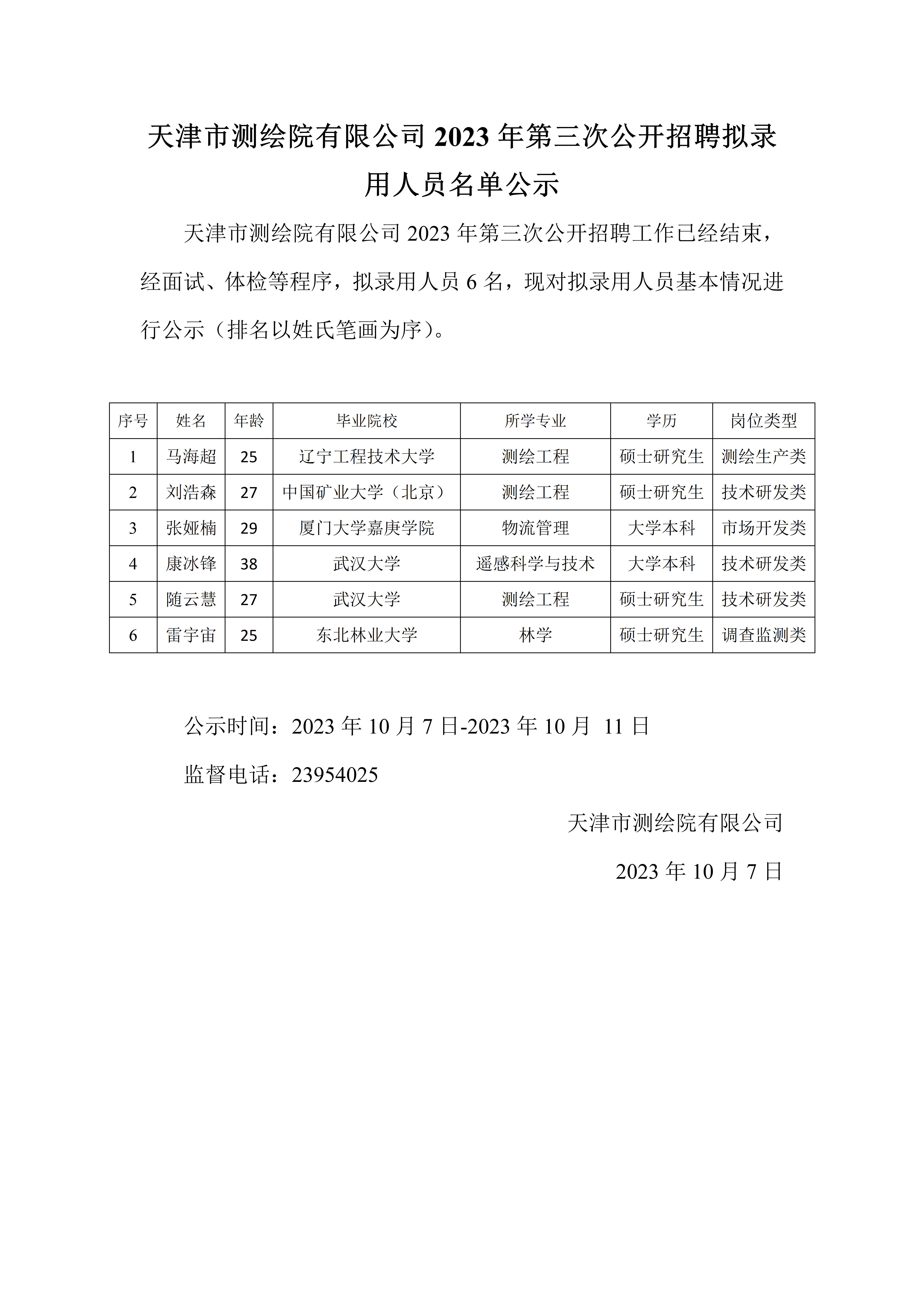 天津市測(cè)繪院有限公司2023年第三次公開招聘擬錄用人員名單公示